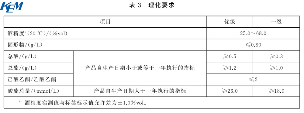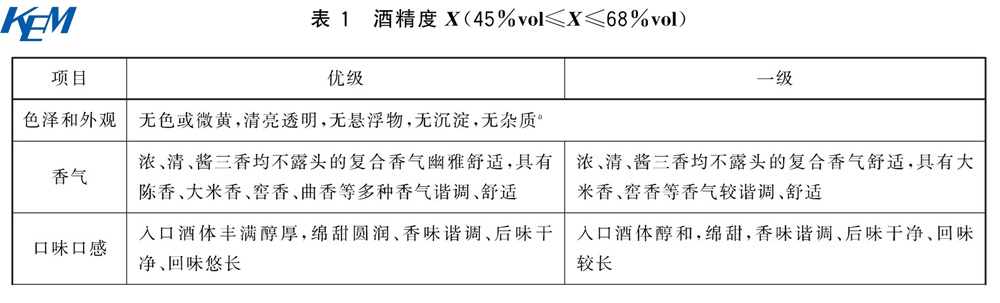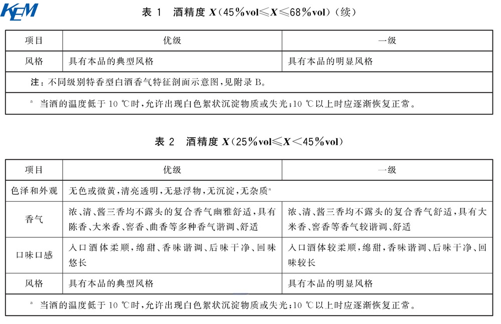 不同酒精度范围产品的感官要求应分别符合表1和表2的规定。