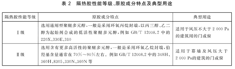 隔热胶性能等级、原胶成分特点及典型用途见表2。
