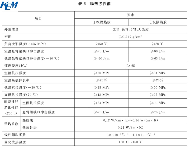 隔热胶的导热系数、线性膨胀系数、固化放热温度参见表6,其他性能应符合表6规定。