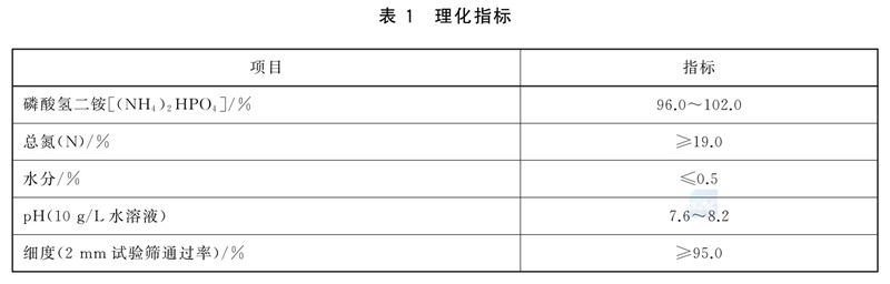 技术要求外观与性状应为白色晶体、结晶性粉末或颗粒。鉴别应符合铵离子、磷酸根离子的鉴别试验特征。理化指标应符合表1的要求。卫生指标应符合表2的要求。取样按 GB/T 14699 的规定执行。试验方法鉴别磷酸氢二铵[(NH4)2HPO4]含量按 GB 1886.331-2021 中A.3的规定执行。GB 1886.331-2021 食品安全国家标准 食品添加剂 磷酸氢二铵