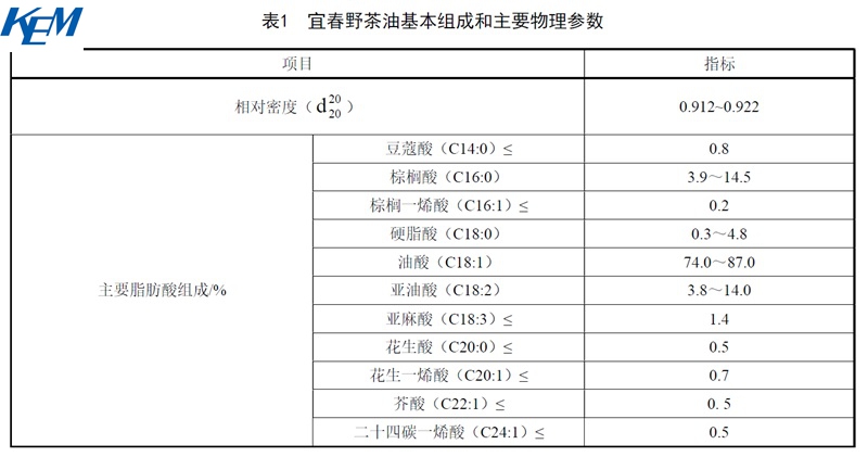 宜春野茶油基本组成和主要物理参数见表1。这些组成和参数表示了宜春野茶油的基本特性,当用于真实性判定时,仅作参考使用。