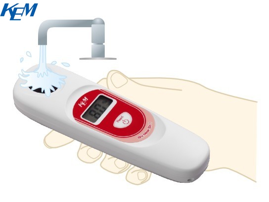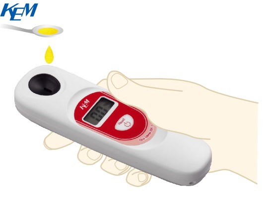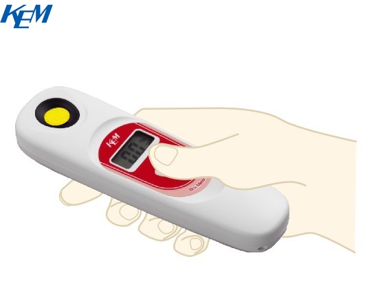 这是一款可以轻松方便测量糖含量的糖度计。 只需将样品放在仪器顶端的测量部分,然后按下测量按钮,大约 2 秒钟后即可显示糖含量。