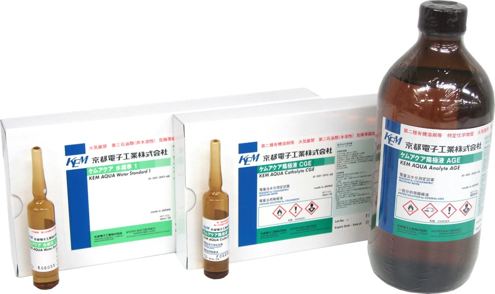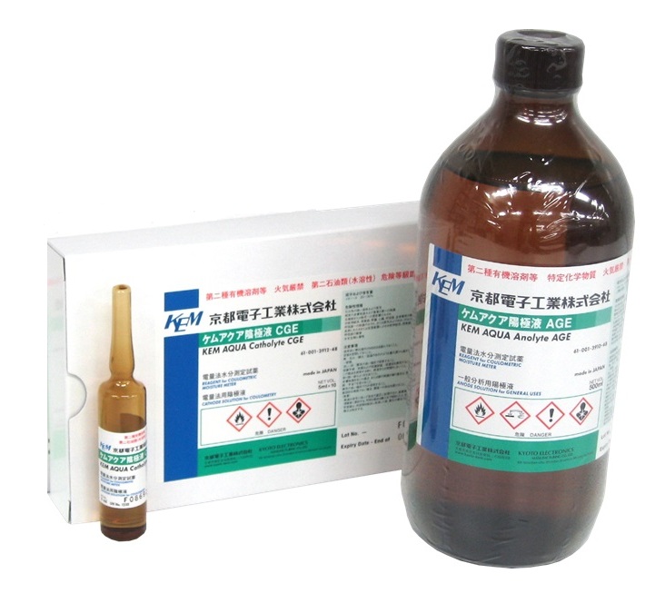 库仑电量法卡尔费休水分测定仪需要使用阳极电解液和阴极电解液。KEM AQUA系列的阳极液,根据用途分为: 一般样品、醛酮类样品和油类样品,阴极溶液可以共用,可节省试剂使用成本。主要特点:■ KEM AQUA 阳极液AGE / 阴极液CGE因为不含四氯化碳和氯仿,所以环境污染少,可以放心使用。石油产品测定和水分气化装置使用时,不需要添加其他溶剂就可以直接使用。KEM AQUA阳极液AGE(100mL)可测定约800mg的水分,KEM AQUA阴极液CGE(5mL)可测定约150mg的水分。■ KEM AQUA 阳极液AO / 阴极液CGE适用于油类样品、石油产品的水分测定。对于石油产品有良好的溶解性。■ KEM AQUA 阳极液AKE / 阴极液CGE因为不含氯仿和乙二醇甲醚,所以环境污染少,可以放心使用。适用于酮类、低含量羧酸类和部分醛类样品。KEM AQUA阳极液AKE(100mL)可测定约300mg的水分,KEM AQUA阴极液CGE(5mL)可测定约100mg的水分。